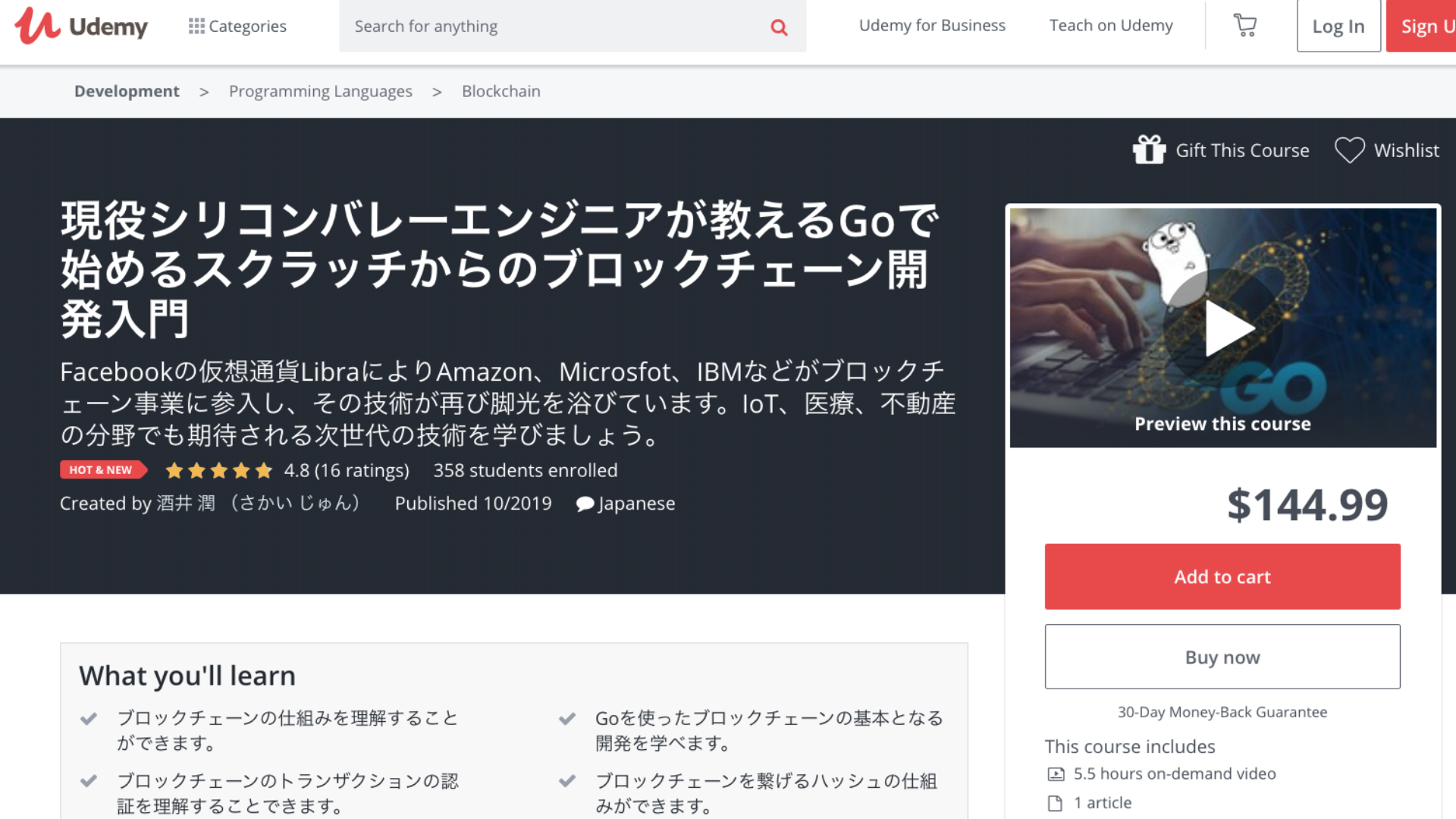本コースでは、Goを使いスクラッチからブロックチェーンを開発します。Blockchain技術は難しい技術資料が多く、わかりにくい点が多々ありますが、実際にコーディングして実装すること で理解がしやすくなることかと思います。また、ブロックチェーンができるエンジニアの求人はシリコンバレーでも増えており、今後ブロックチェーンが開発できるエンジニアの希少性が高まることかと思います。プロックチ ェーンのエンジニアならないとしても、ブロックチェーンを実装された経験は就職や転職の際に提出する履歴書の中でも目立つものとなることかと思います。この機会にブロックチェーンの実装をしてみませんか。