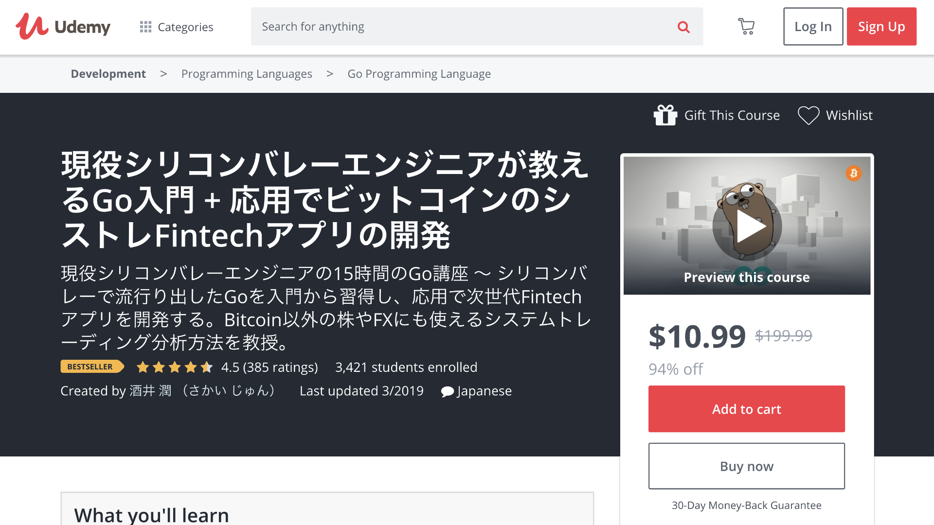 このコースでは、Goの基礎である入門コースを一通り終えた後に、次世代のFintech(金融+テクノロジー)のアプリケーションとしてビットコインを自動でシステムトレードを行うアプリを開発します。多くの言語の良い部分を取りれたGoは、コードを実行する際のパフォーマンスも良く、近年急速にライブラリも充実して来ており、シリコンバレーで多くの企業が取り入れ始めました。日本では、ドキュメントも少なく、Go言語を使う機会があまりないかもしれませんが、世界のトップ企業はすでに使い始めているため、技術レベルで世界から遅れないように今からGo始めると良いかと思います。