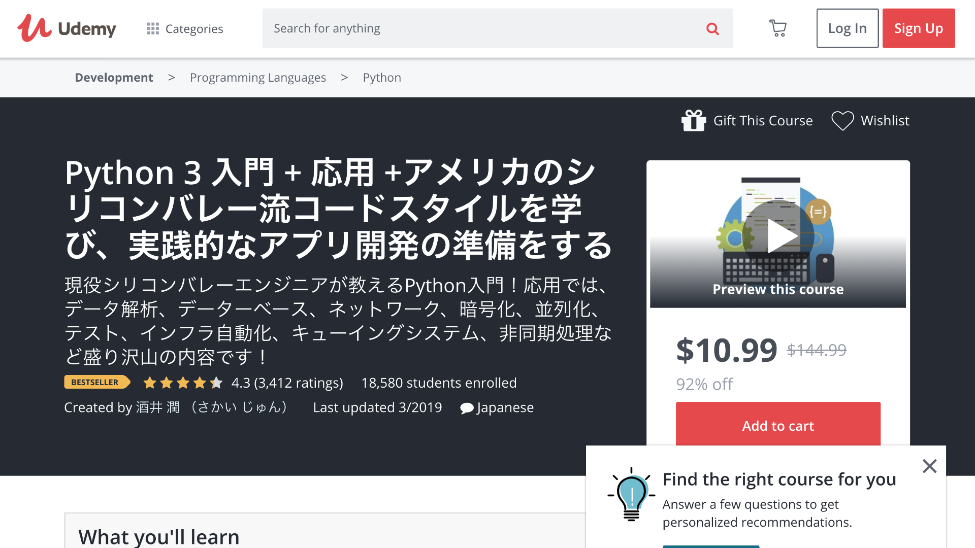 このコースでは、Python3の基礎である入門コースを一通り終えた後に、今後のアプリケーション開発に役立つためのPython のテクニックやデーターベースアクセス、WEB関連などのPythonを使った応用編を取り入れております。また、Pythonのコードをただ書いて、プログラムが動けば良いというだけではなく、コードスタイルに関しても言及しております。pythonicにと言われるように、PythonはPythonらしく綺麗でわかりやすいコードを書くことが大切です。