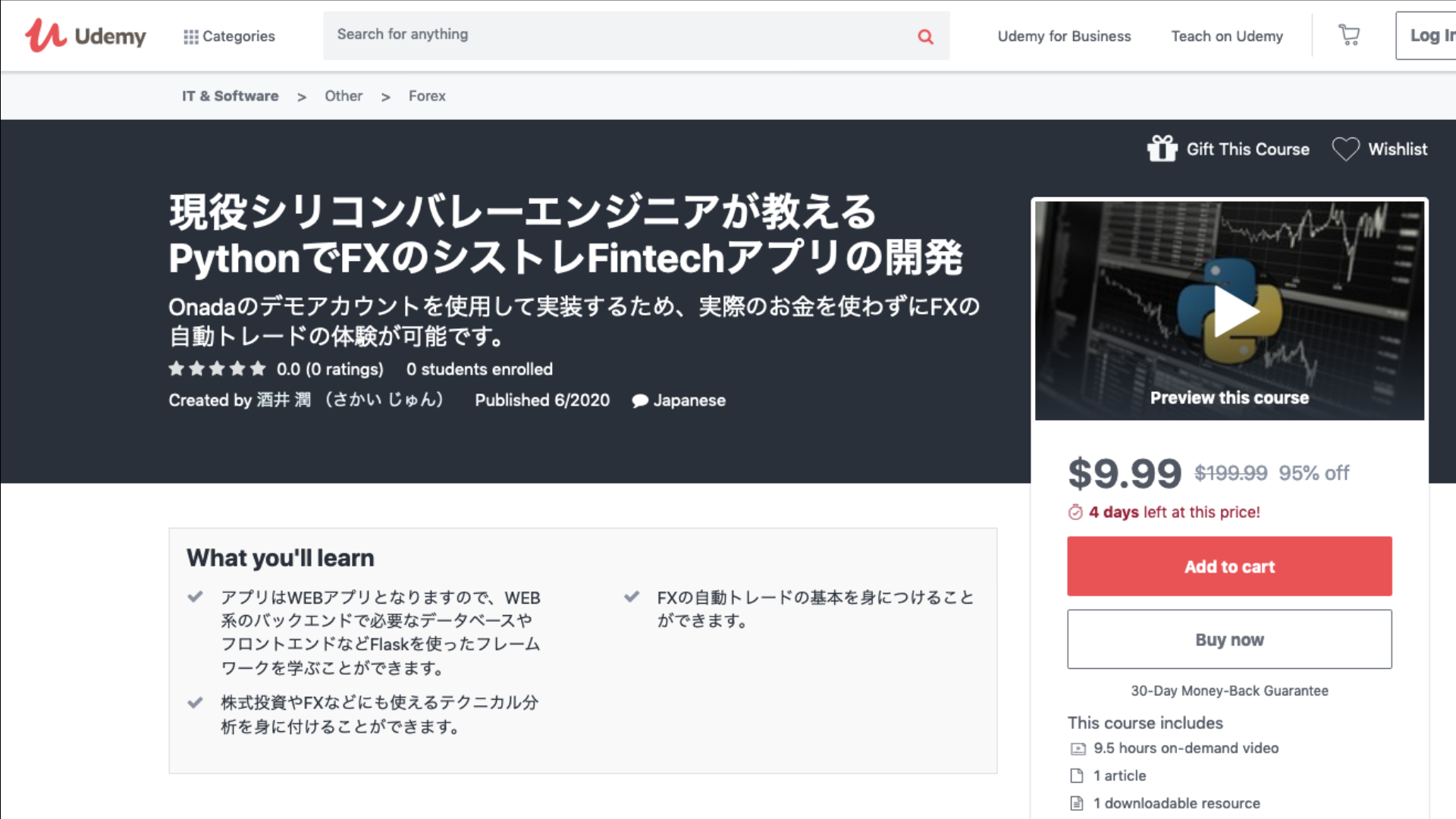今回扱うFintech技術では、日本でも人気のあるFXの自動トレードをPythonで行い、グローバルで使われているOandaサービスのAPIを使って行います。日本で人気があるという理由でFXにしましたが、FXではなくても、APIを使ってトレードするやり方さえ学べば、例えば株式や仮想通貨のトレードなどでも十分に使える技術を学ぶことができますので、FXにご興味ない方でも自動トレードが何かということを学べる講座になっております。
