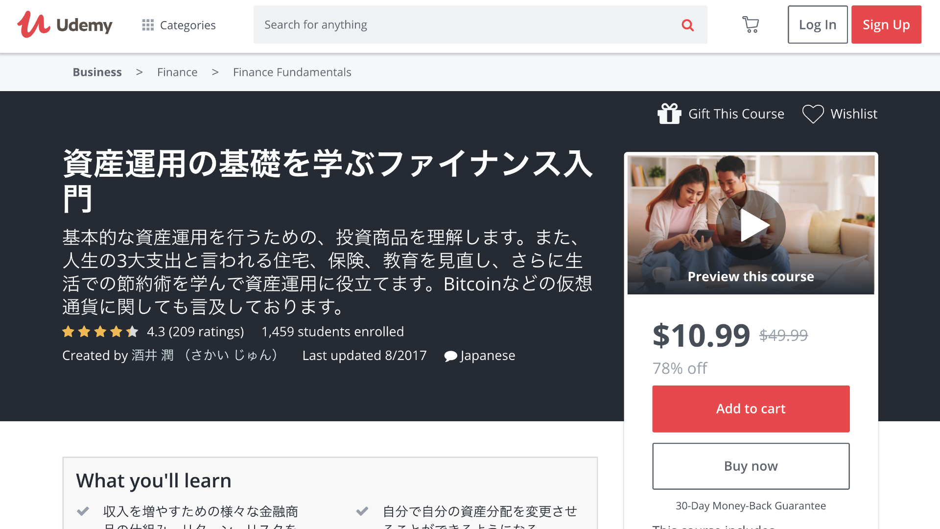 お金を増やすには、支出を減らし、収入を増やすことです。節約をして、支出を減らすだけではなく、節約して貯めたお金を使って資産運用することでさらに収入を伸ばします。このコースでは、安全でリスクの低い金融商品からハイリスクハイリターンな金融商品も紹介します。また資産運用の参考例なども紹介していきます。また、支出をやらすために人生3大出資と言われる住宅、保険、教育にかかるコストの見直しや節約術なども紹介していきます。
