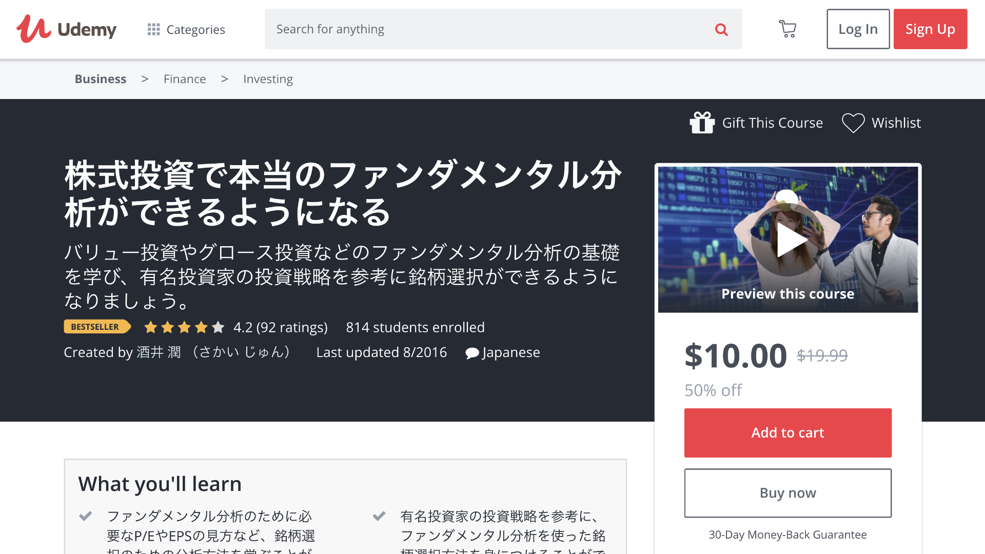 このコースでは、まずはファンダメンタル分析のポイントを抑えて、その後に有名投資家の投資戦略も紹介しながら、どのように銘柄選択をするのかということを学びます。コースの対象は、株式投資でのファンダメンタル分析とは何かを知らない方、また株式投資を始めたばかりの方など、どうやってファンダメンタル分析を使って、銘柄選択すればいいのかわからない方を対象としています。