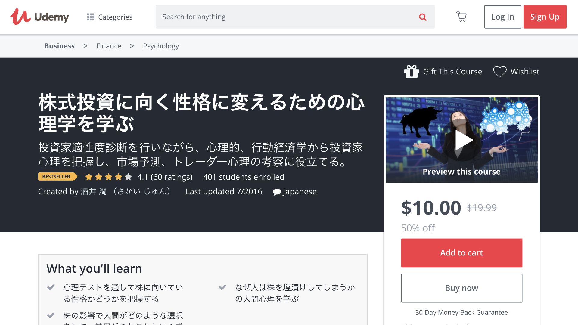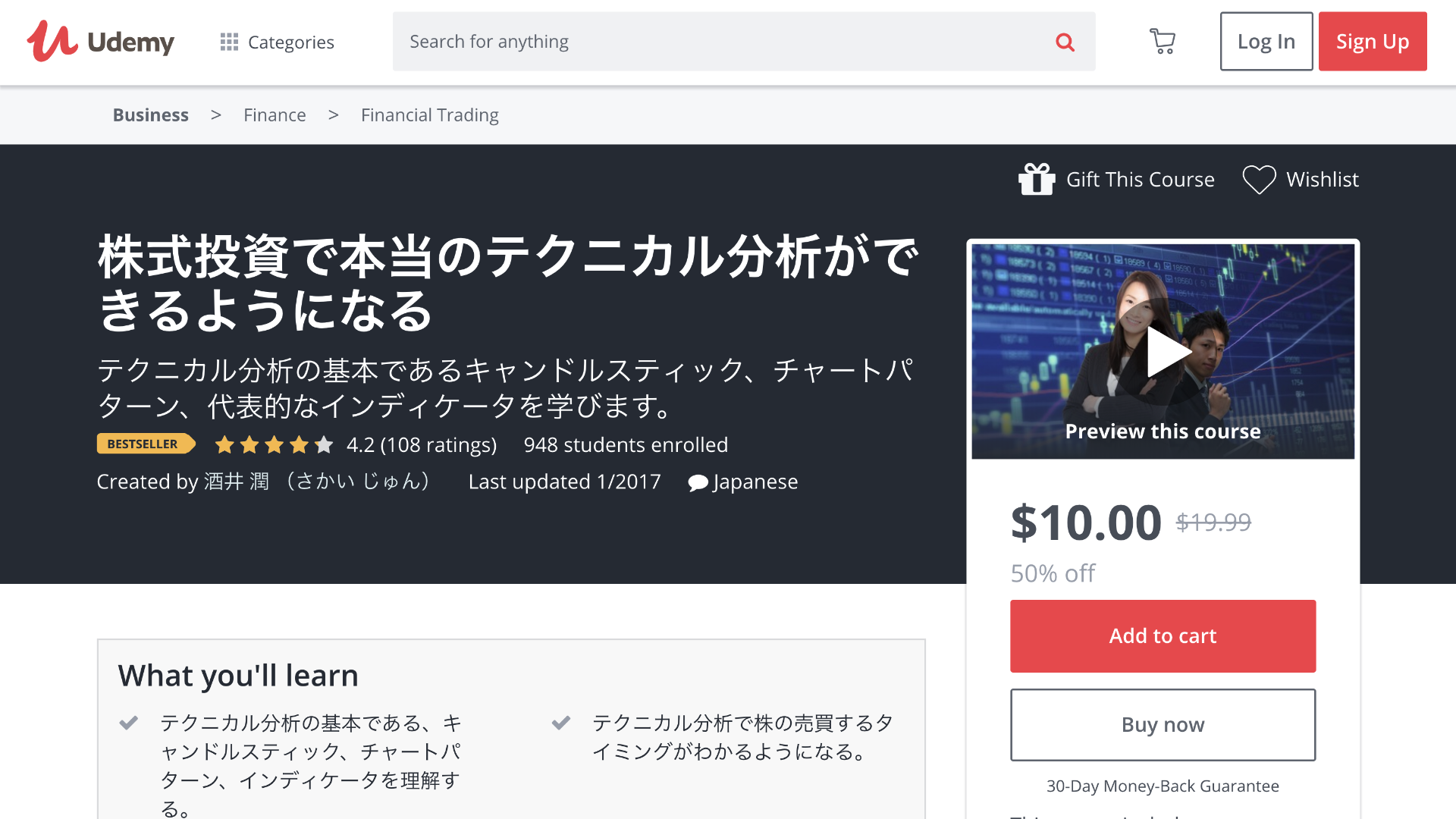 このコースでは、テクニカル分析の基本である、キャンドルスティック、チャートパターン、代表的なインディケータを学びます。その後に、私が利益をあげているシステムトレードの投資戦略も紹介いたします。コースの対象は、株式投資の経験があり、テクニカル分析で株の売買するタイミングを学びたい方、またテクニカル分析の使い方やルールの決め方がわからない方を対象としています。