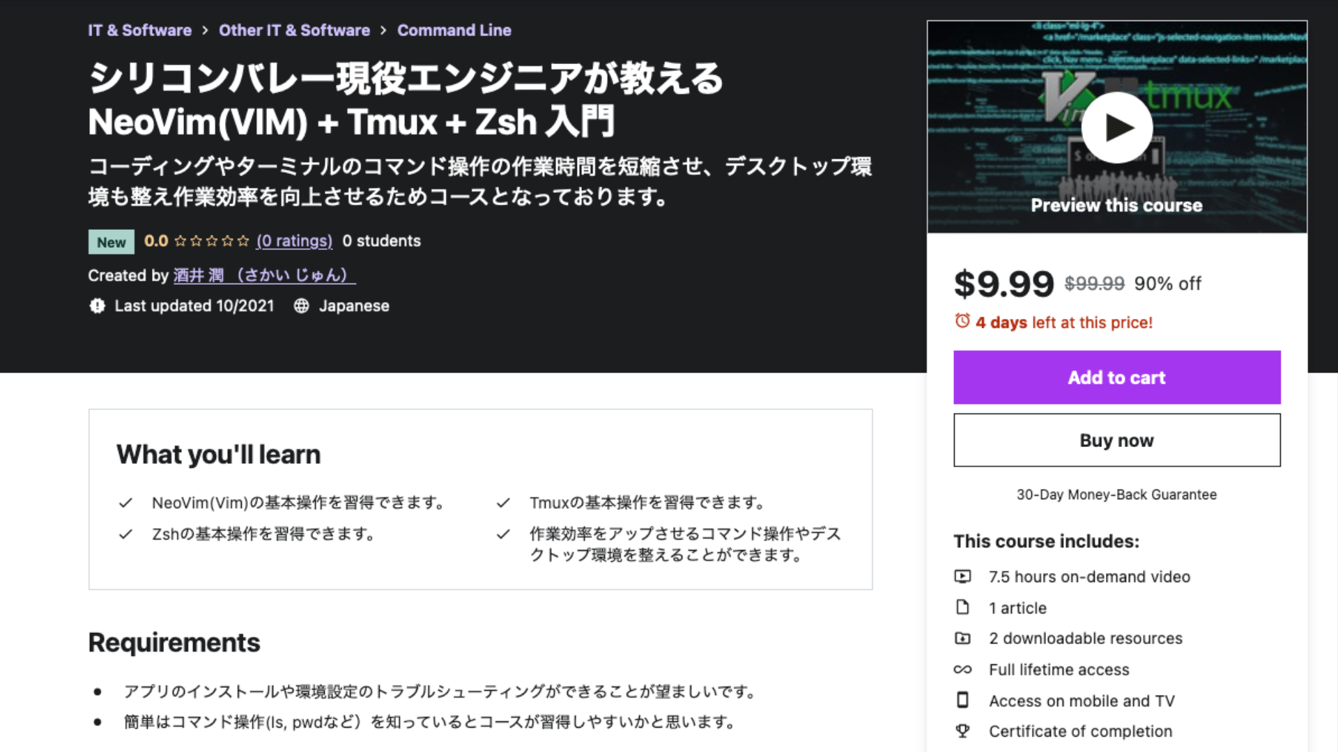 本コースは、NeoVIM, Tmux, Zshで作業効率を高めるコースとなっております。世界で一番使われているEditorはVIMです。もちろん開発にはVS CodeやPycharmなどのIDEが使われますが、プラグインとしてインストール>できるので、IDEを用いたコーディングでもVIMの機能で素早くコーディングする人が多いです。また、ターミナルでのコマンド操作もTmuxの画面分割やZshの便利なプラグインなどで作業効率のスピードが速くなりますので、Vimだけではなく、Tmuxだけではなく、Zshだけではなく、組>み合わせ、シームレスなナビゲーションを行って、作業時間を効率的に短縮できることかと思います。