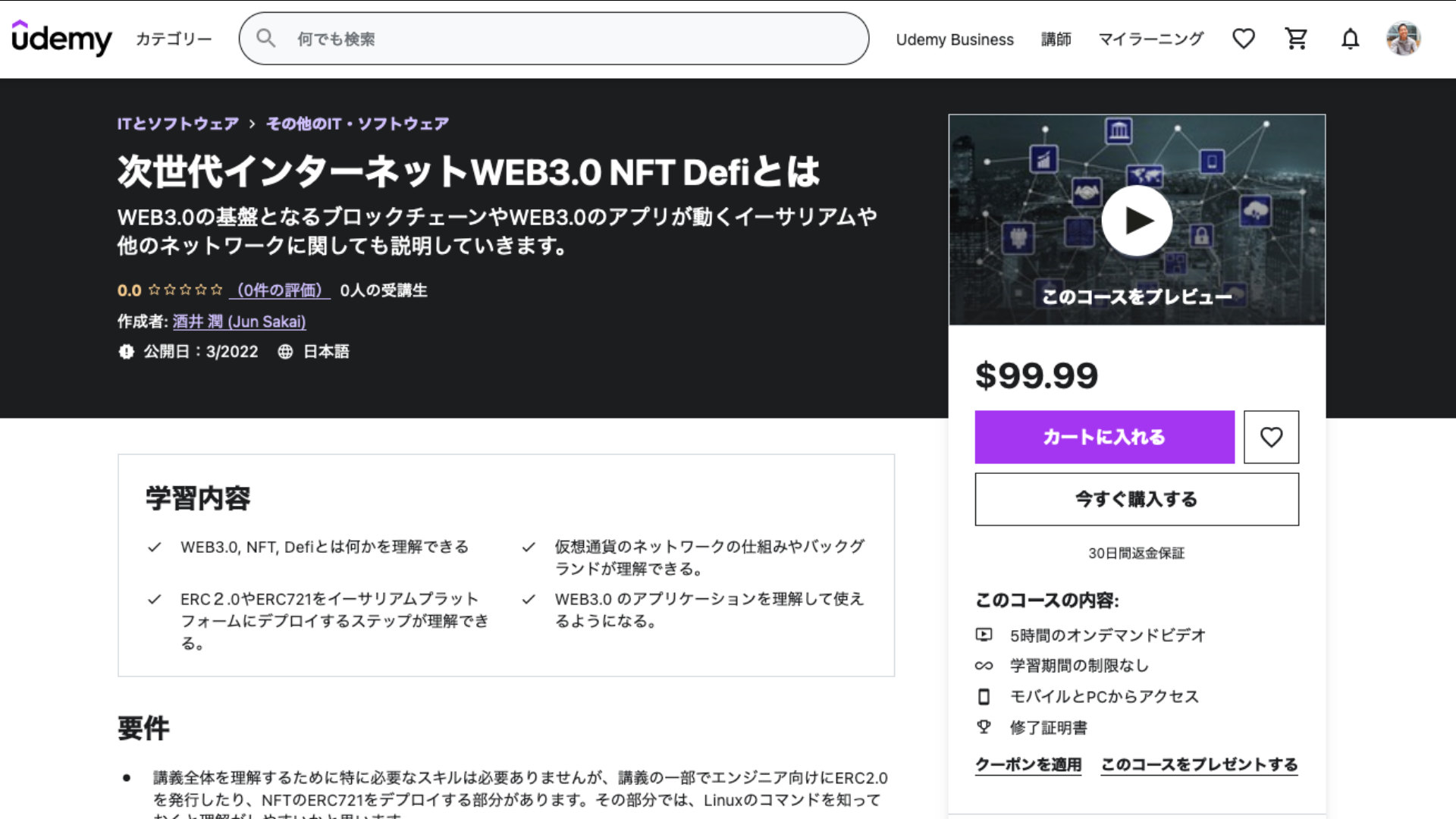 本コースでは、ビジネスパーソン向けにWEB3.0とは何か、またNFTやDeFiの理解ができるようなコースとなっております。主にビジネスパーソン向けへのスライドでの説明ですが、エンジニア向けにもERC20のトークンを発行したり、ERC721のNFTトークンをデプロイする手順を紹介する内容も入れおりますので、エンジニアの方にも楽しんでもらえるのではないかと自負しております。